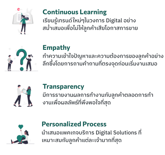 เราคือผู้ให้บริการ Digital Solutions ที่คลอบคลุมและครบวงจร ช่วยให้ธุรกิจก้าวทันเทคโนโลยียุคใหม่ มียอดขายที่มากขึ้น ลดค่าใช้จ่าย และเสริมสร้างประสบการณ์ที่มีประสิทธิภาพมากขึ้นให้กับทั้งลูกค้าและพนักงาน